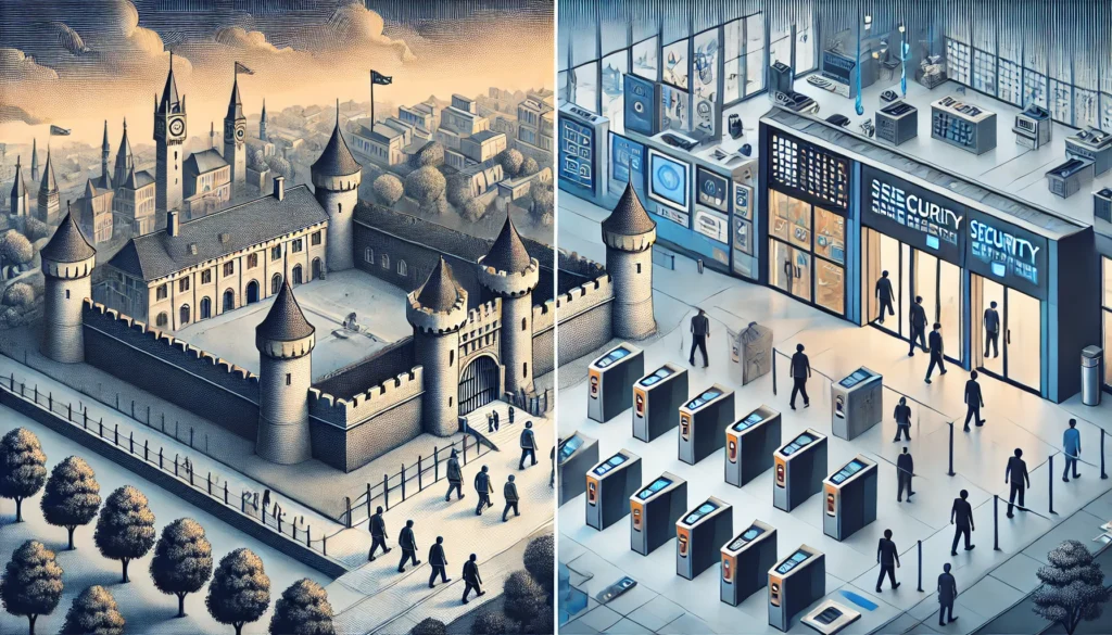 Traditional security models assume the internal network resembles a fortress with massive walls, moats, and watch guards pacing around the boundaries. A firewall is seen as the watch guard that protects the entrance to the fortress. All entities inside the perimeter are entirely trusted. The mindset is that within the network, you are safe. Think of the castle where the guards only screen people at the entrance gate. Once inside, you can get anywhere; it is a free-for-all.